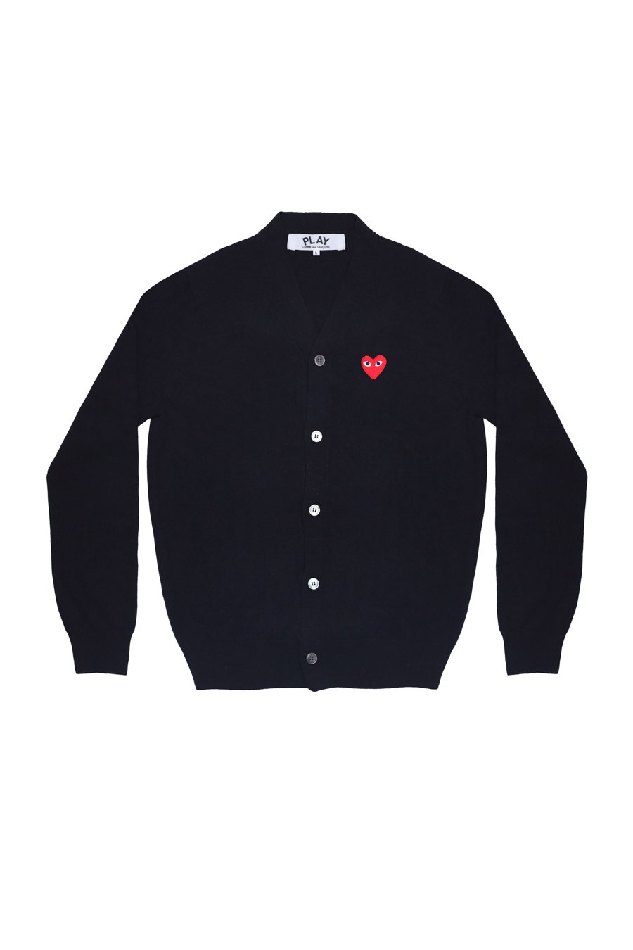 Long sleeve knit wool cardigan in black. Featuring signature heart logo patch in red. Rib knit at Y-neck collar, cuffs, and hem. Button closure at front.
