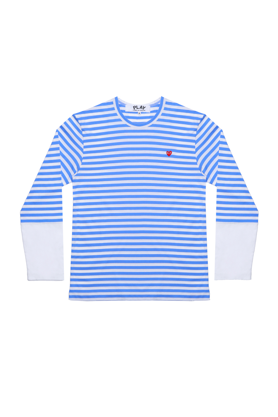 Paneled cotton jersey T-shirt in blue & white. Stripes printed throughout, crewneck, embroidered small heart logo patch in red.