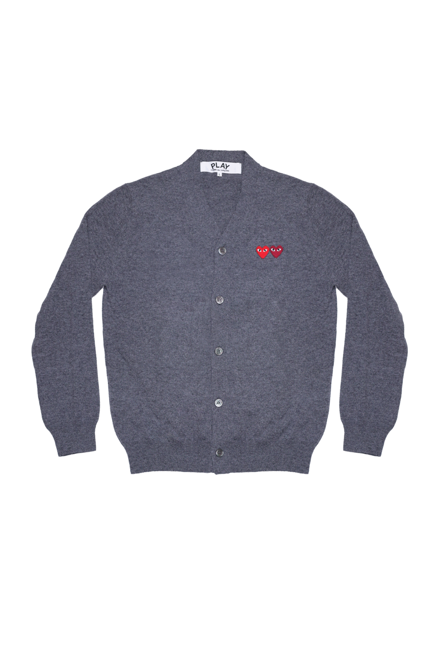 Grey wool embroidered logo cardigan from Comme Des Garçons Play. Featuring a V-neck, a front button fastening, long sleeves and a straight hem.