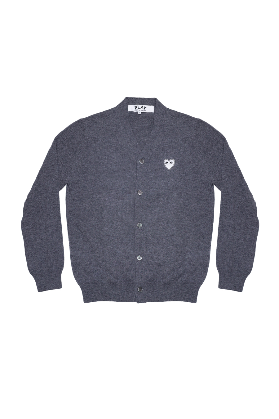 Grey heart logo cardigan. Featuring signature heart logo patch in white, V-neck shape, front button fastening, and long sleeves.