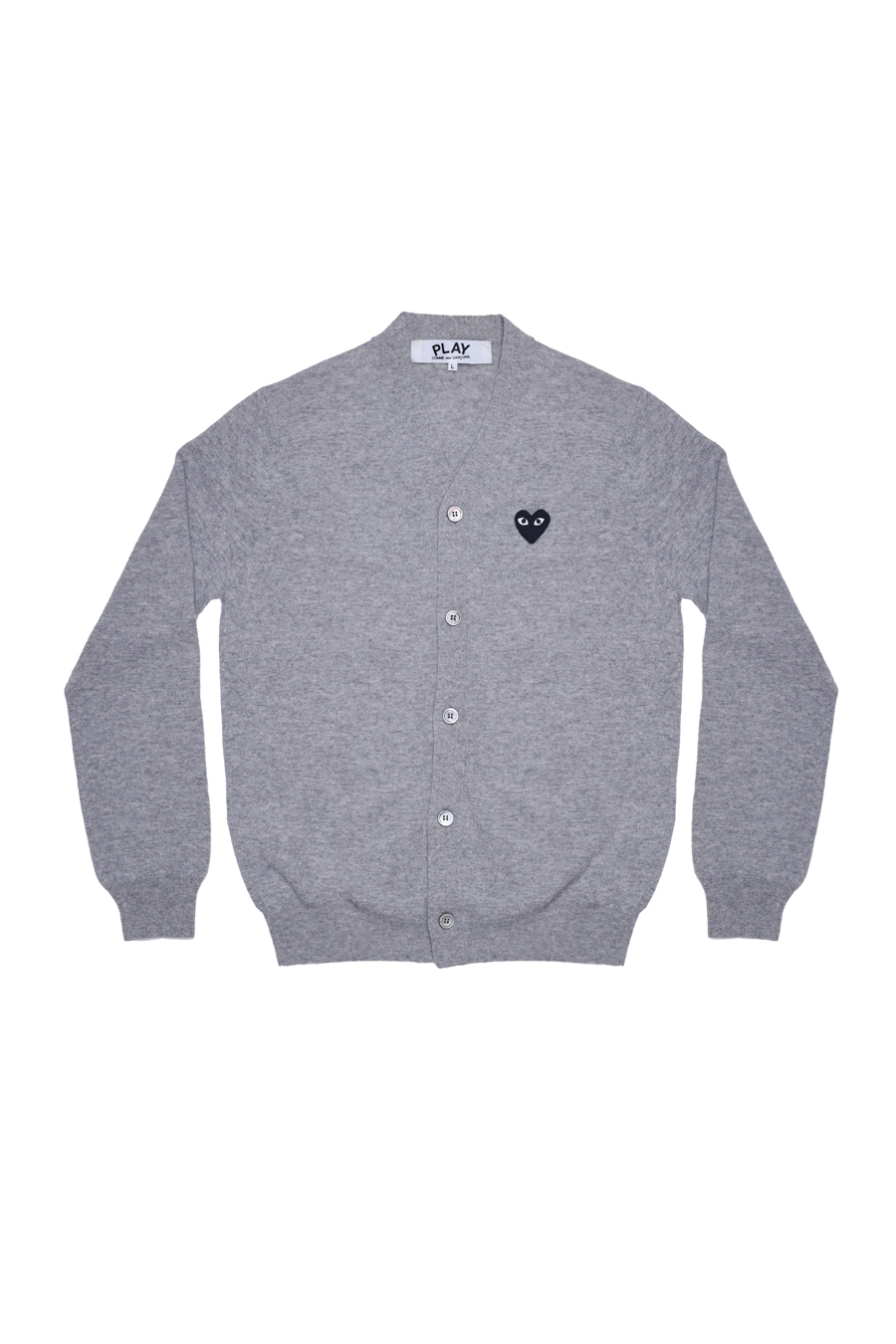 Light grey cardigan with signature black heart logo patch in front, V-neck shape, front button fastening, and long sleeves.