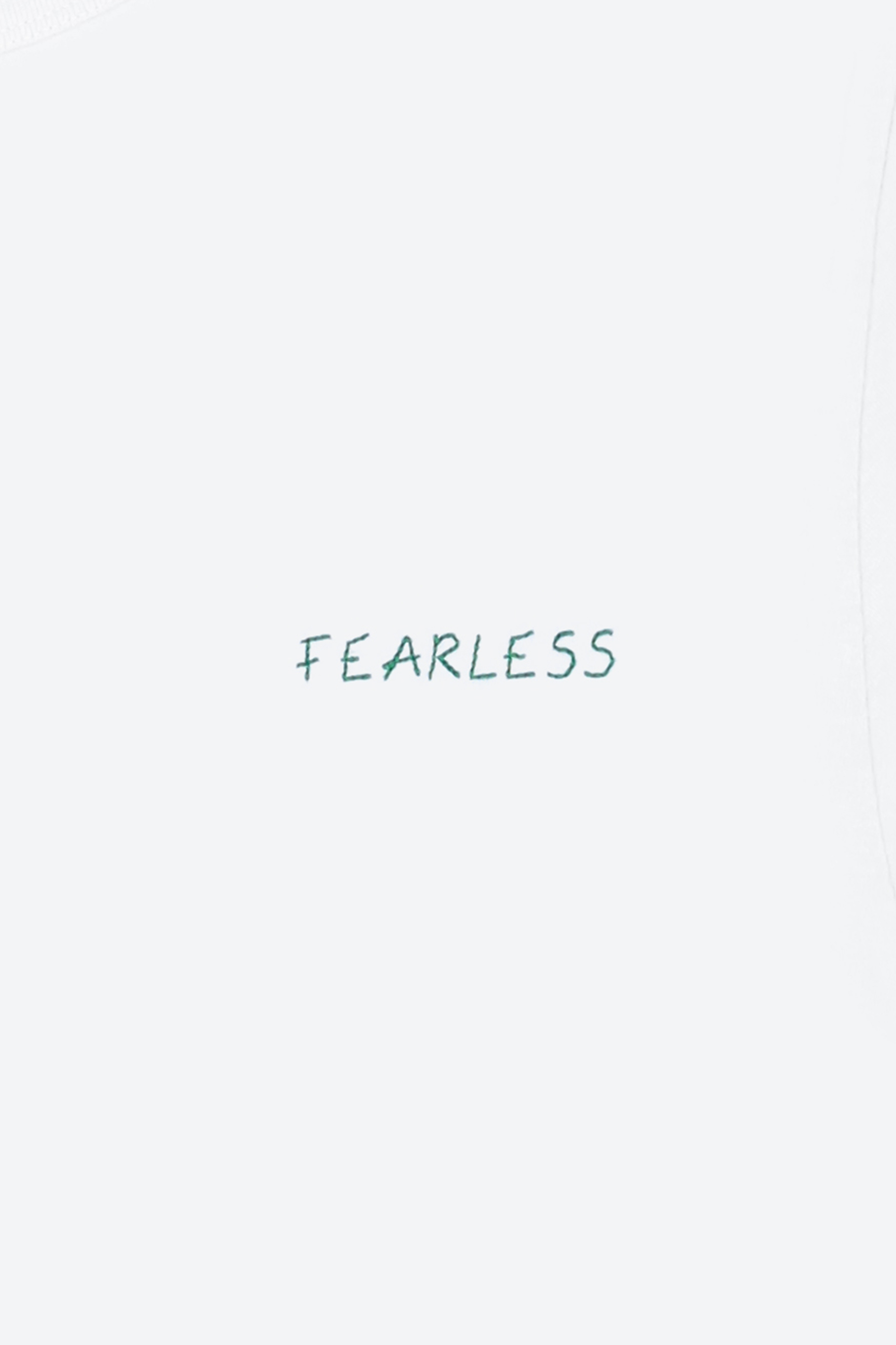 White "Fearless" cotton T-shirt from Maison Labiche featuring embroidered slogan, crew neck, short sleeves and straight hem.