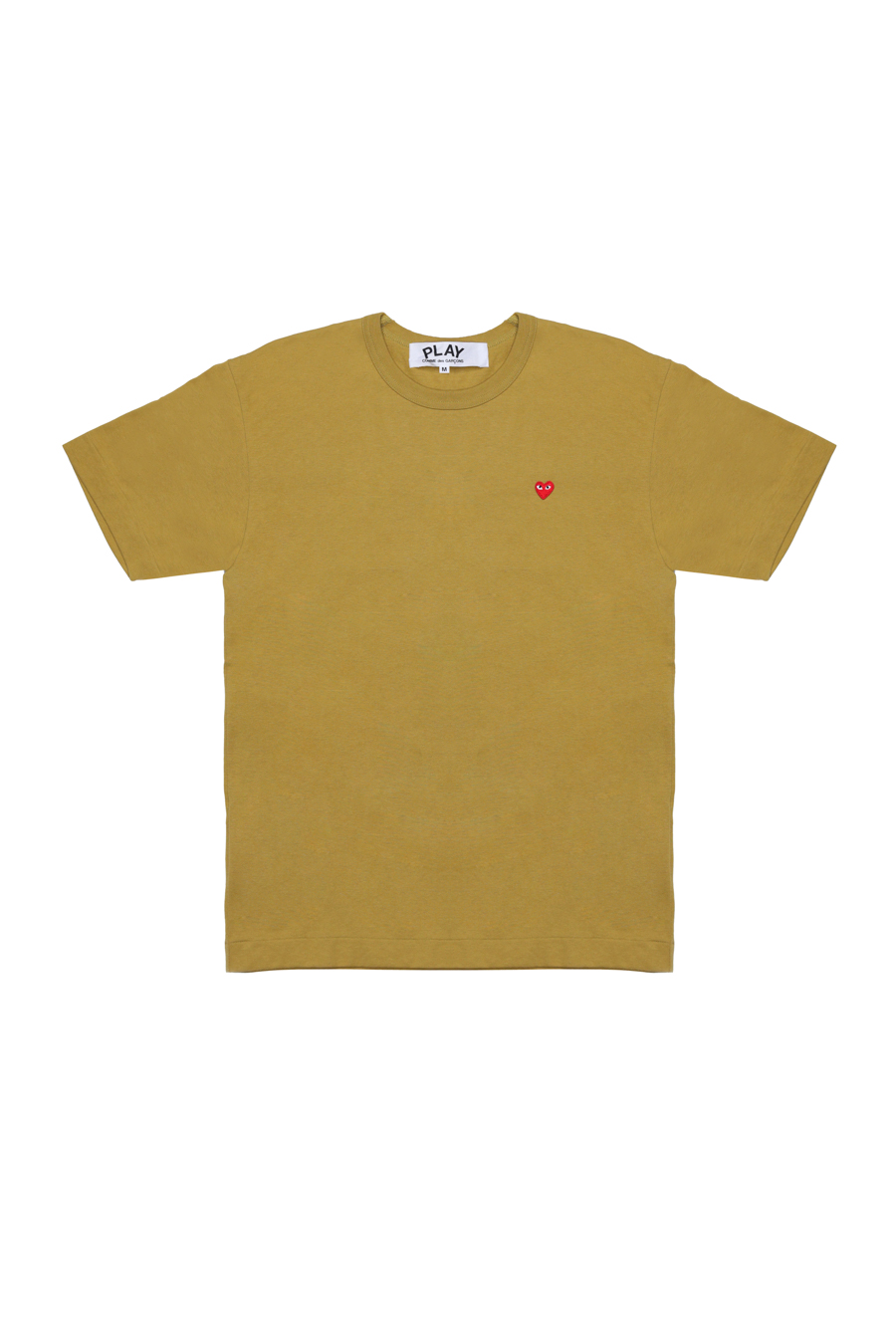 Olive classic T-shirt from Comme Des Garçons Play. Featuring small heart logo patch in red, short sleeves, and round neck.