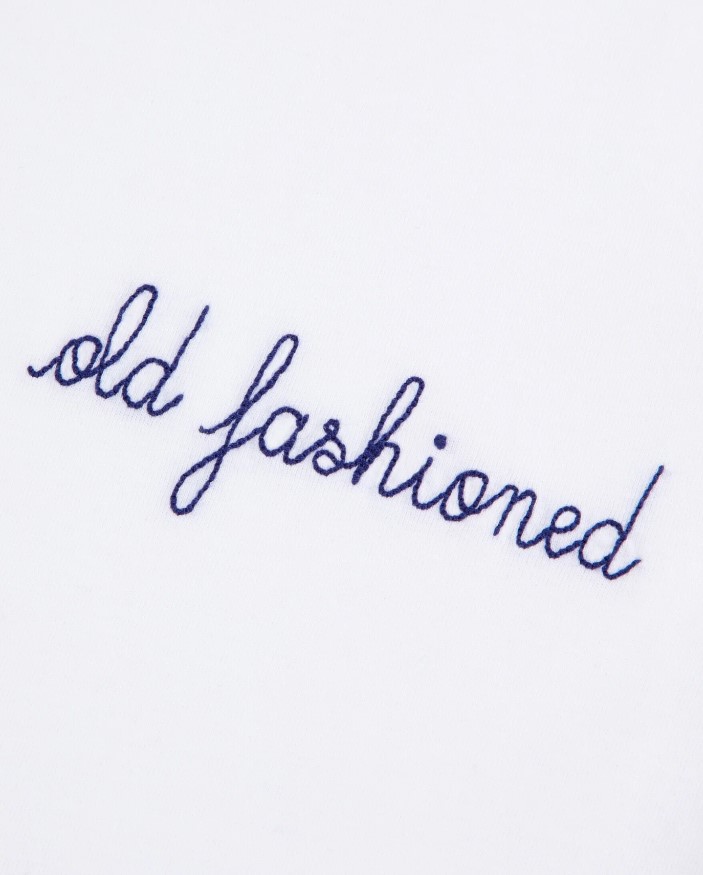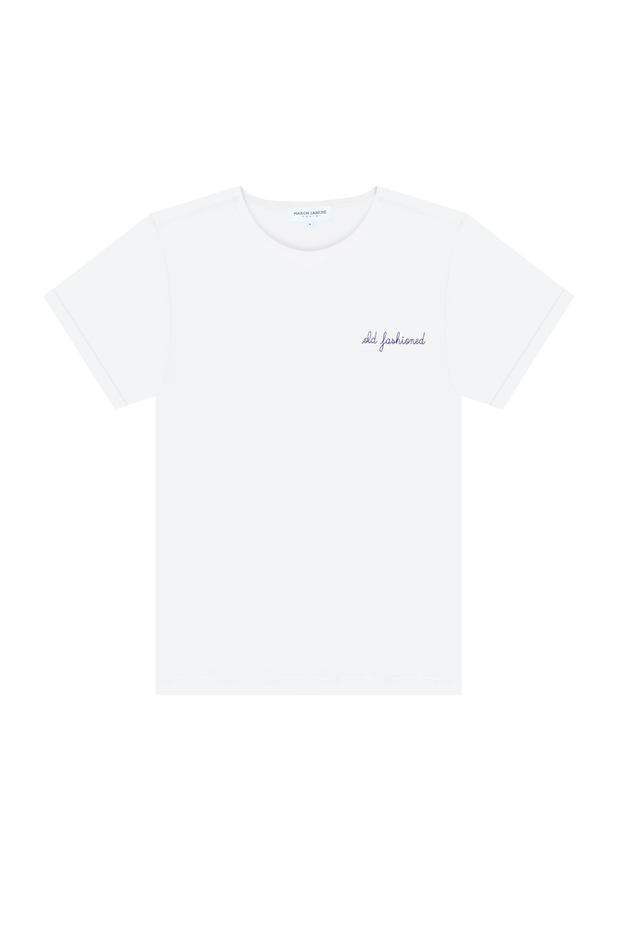 A homage to the classics. Certified organic cotton white T-Shirt from Maison Labiche. Featuring embroidered "Old Fashioned" at front, slightly fitted, straight cut, topstitched, ribbed knit neckline, and rolled sleeves.