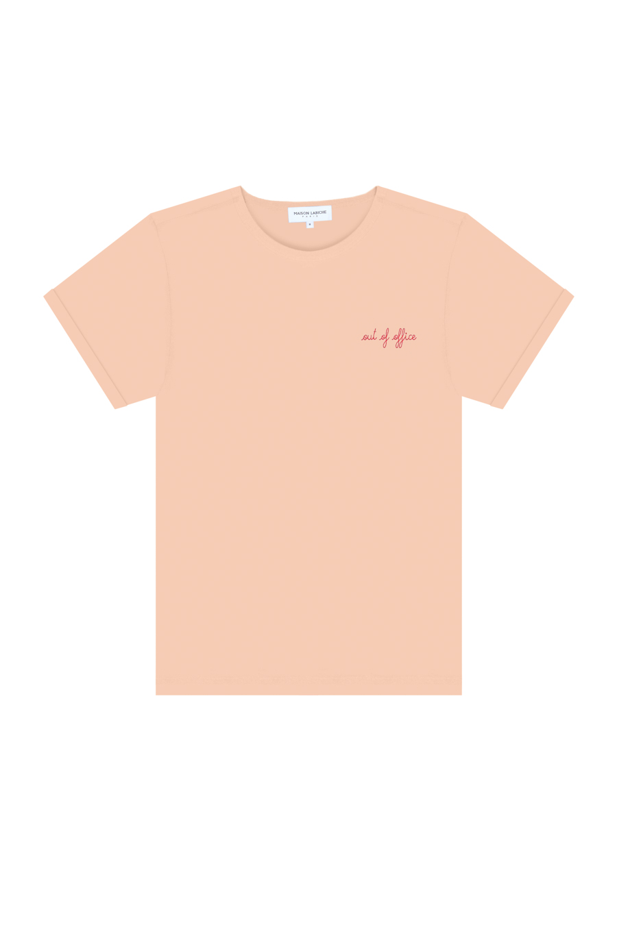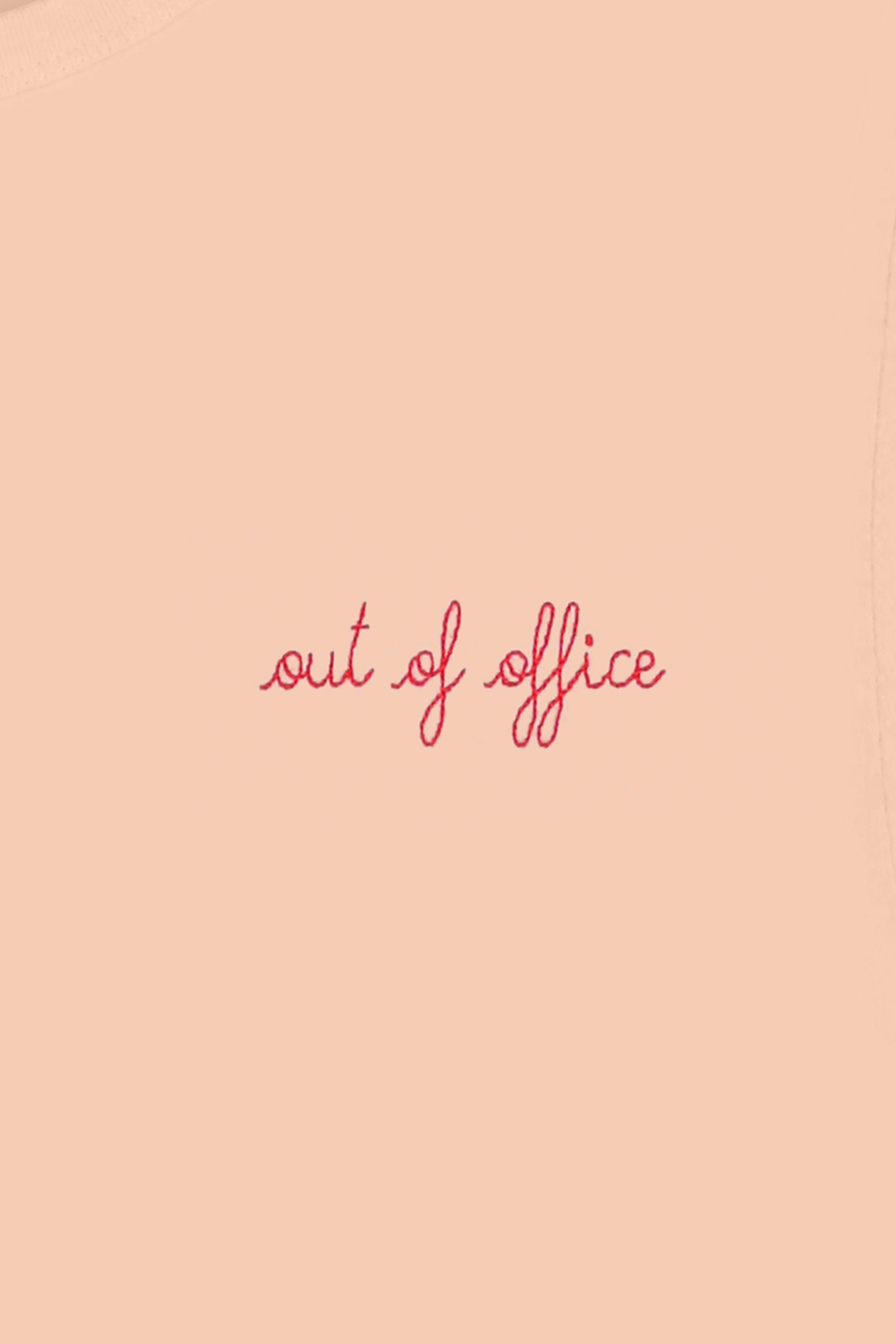A reminder that sometimes, a break is all you need. Certified organic cotton T-Shirt with embroidered text "Out Of Office" at front. Slightly fitted, straight cut, topstitched, ribbed knit neckline, and rolled sleeves.