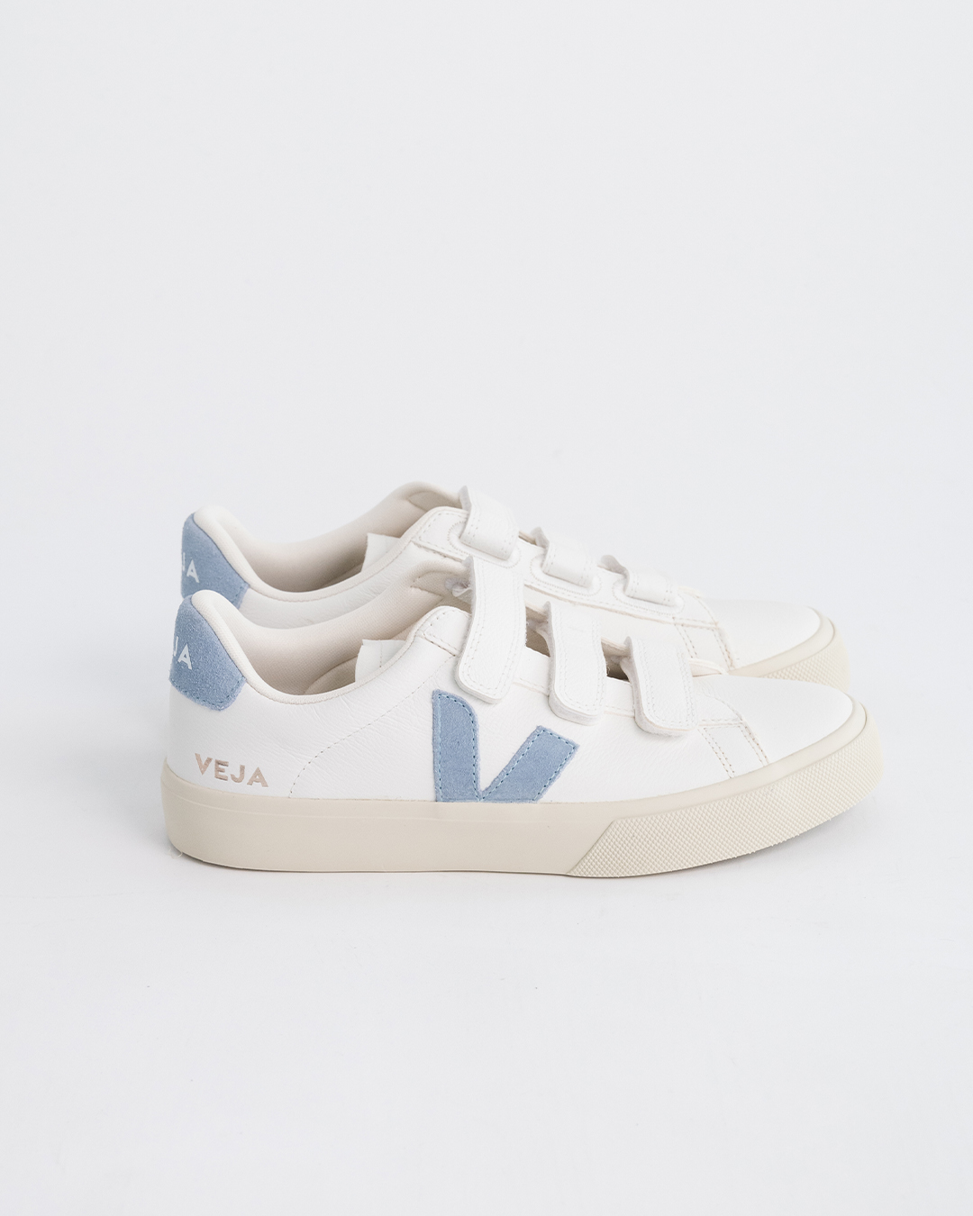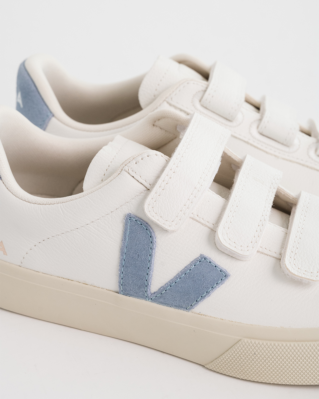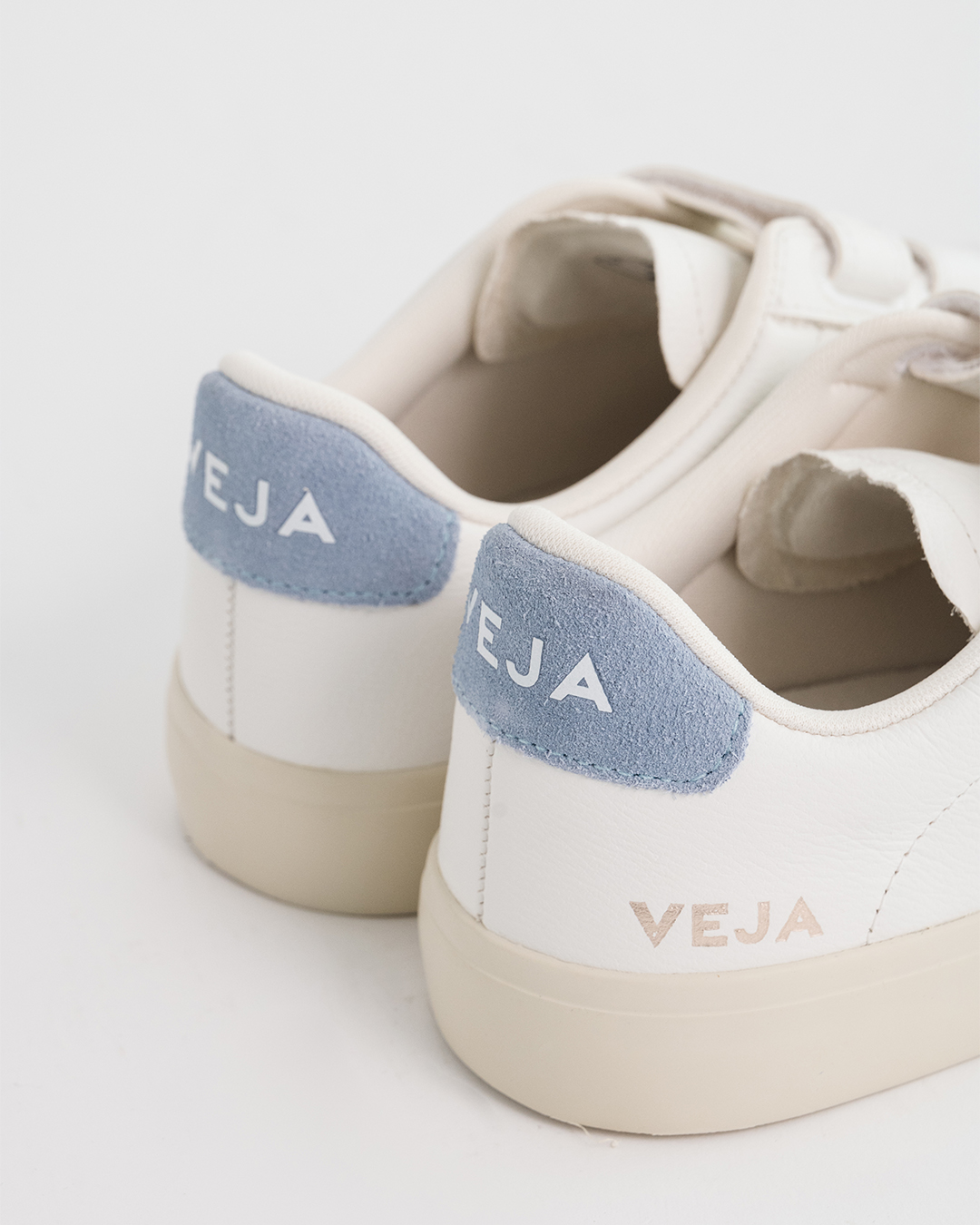 Brazilian-tanned, chrome-free leather plus suede upper breathable tech lining made from 100% recycled polyester triple leather strap closure with hook and loop fasteners V suede appliqués at side walls VEJA branding on tongue padded insole made from 11% Amazonian rubber, 42% sugar cane, 11% recycled EVA & 12% organic cotton vulcanized sole construction (50% bio-based & recycled including 40% Amazonian rubber & 10% recycled rubber) VEJA lettering printed on suede heel patch VEJA branding embossed at heel.