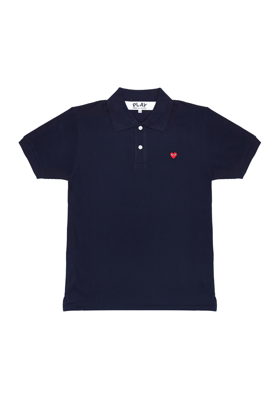 Navy classic polo shirt from Comme Des Garçons Play. Featuring small heart logo patch in red at front, classic polo collar, and short sleeves.
