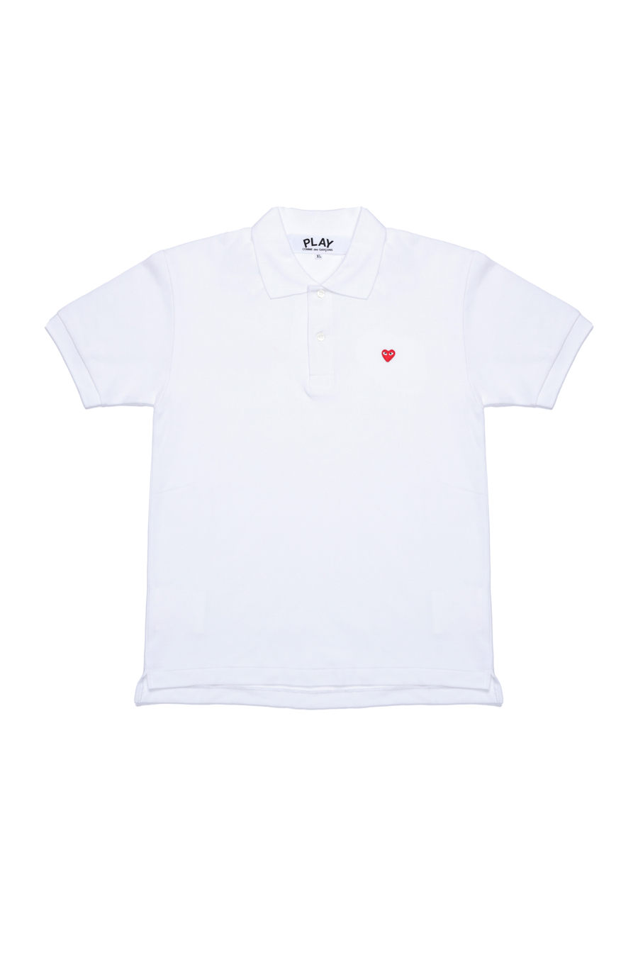 White classic polo shirt from Comme Des Garçons Play. Featuring small heart logo patch in red at front, classic polo collar, and short sleeves.