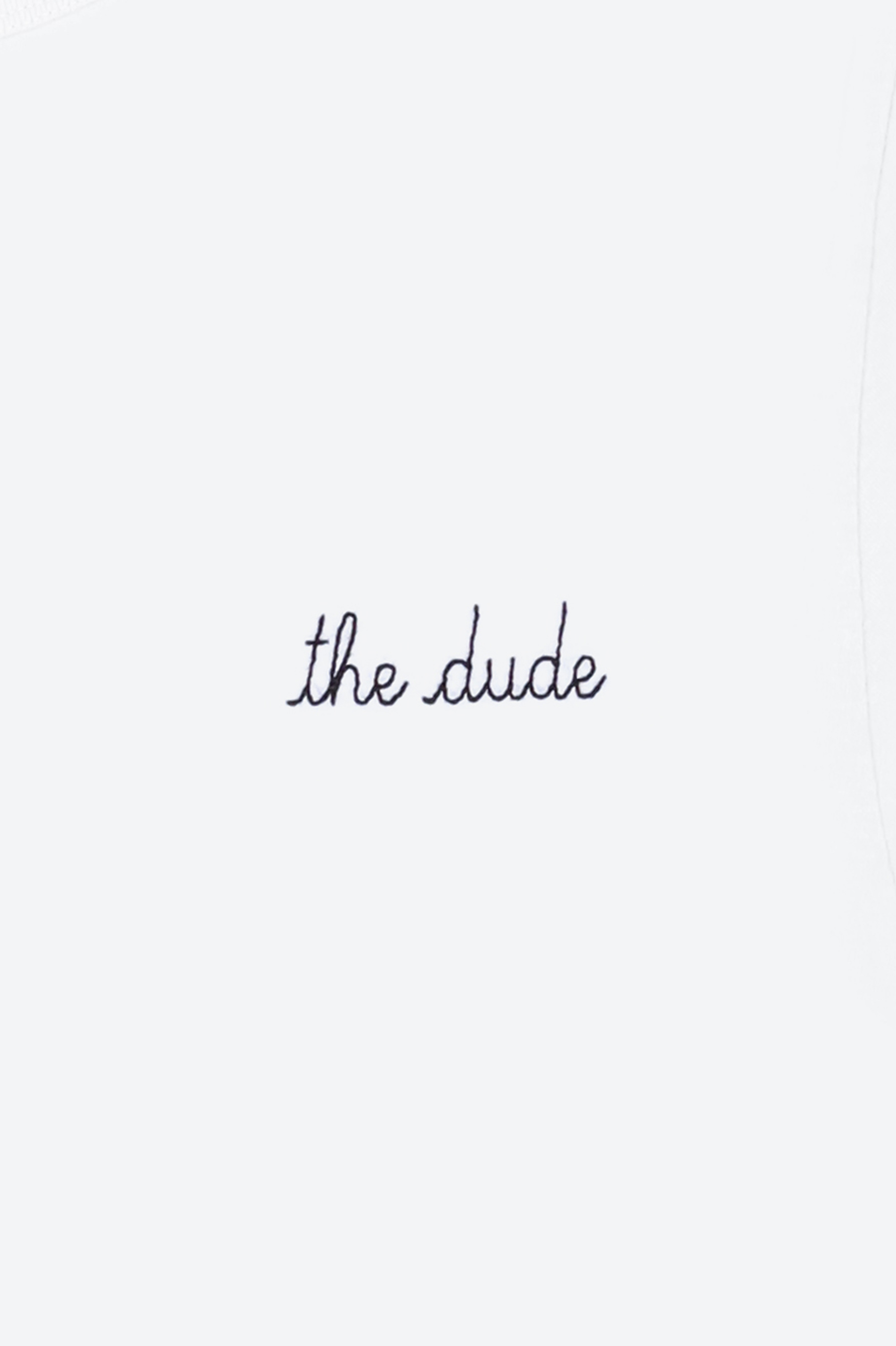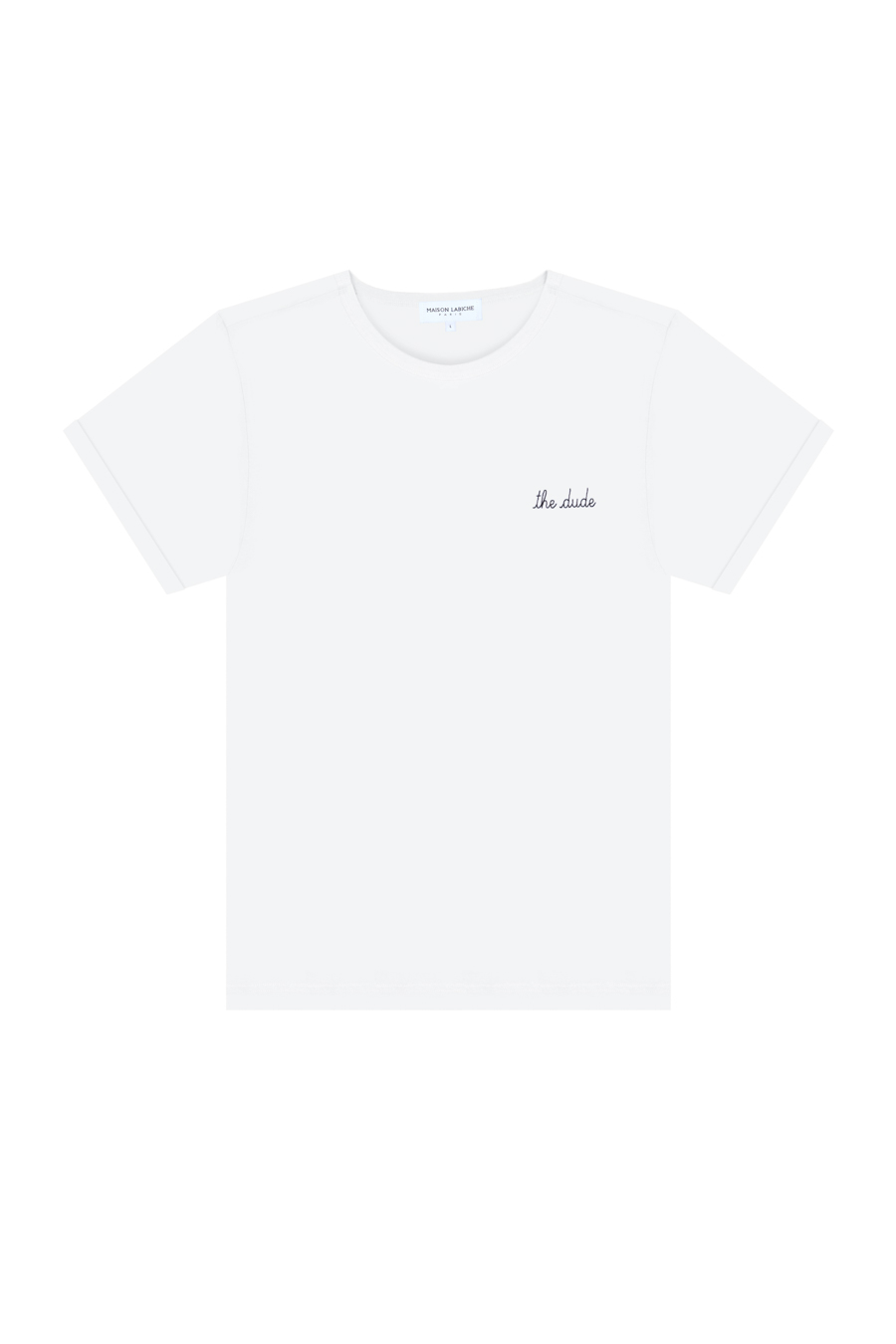 White organic cotton The Dude-slogan embroidered unisex style T-Shirt from Maison Labiche. Featuring embroidered slogan, jersey knit, round neck, short sleeves and straight hem.