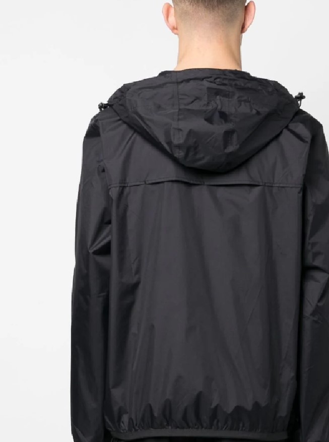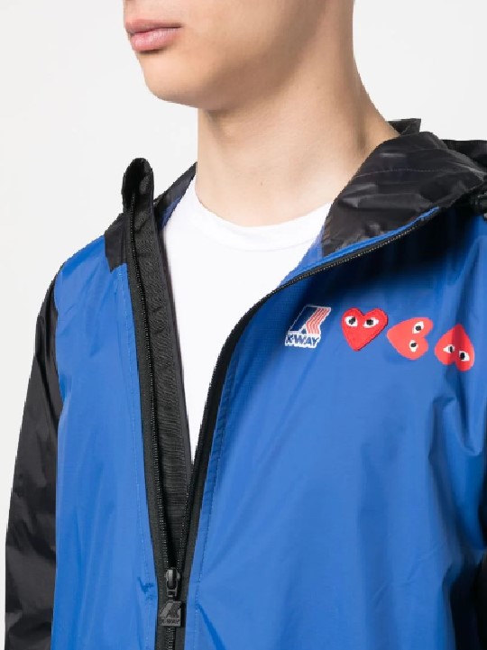 Two-tone jacket from Comme Des Garçons Play x K-Way featuring blue & black two-tone design, graphic print at the chest, stand-up collar, drawstring hood, front zip fastening, long sleeves, elasticated cuffs and straight hem.