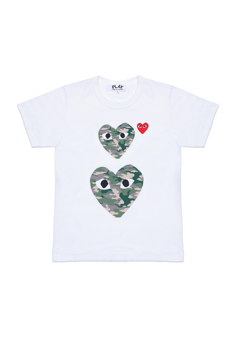White cotton crew neck T-shirt from Comme Des Garçons Play. Featuring camouflage heart printed logo, a relaxed fit, short sleeves, and a straight hem.