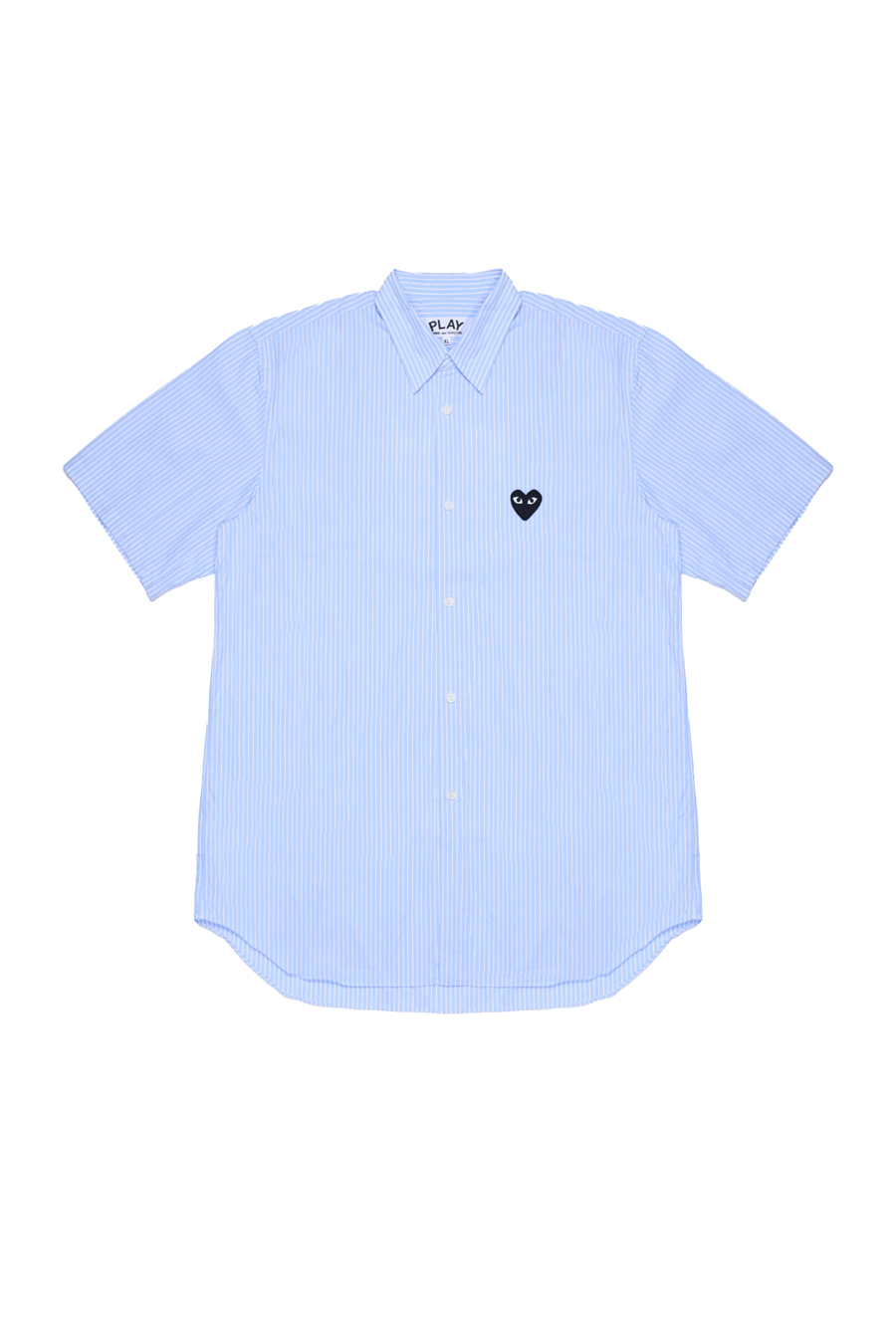 Blue stripe cotton shirt from Comme Des Garçons Play. Featuring a classic collar, short sleeves, signature heart logo patch in black, front button fastening.