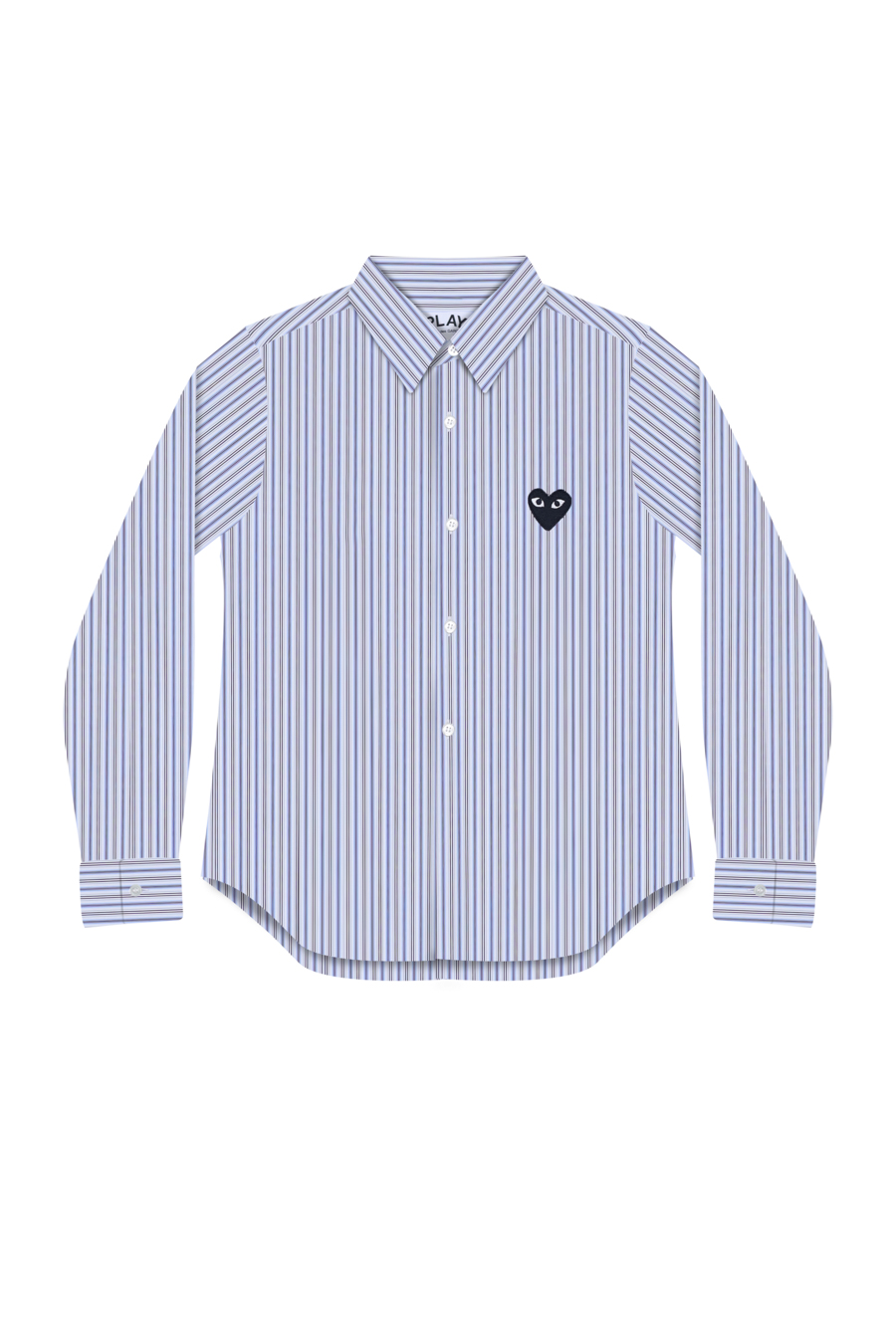 Blue cotton heart-patch striped shirt from Comme Des Garçons Play featuring stripe detailing, classic collar, long sleeves and black signature heart logo patch to the front.